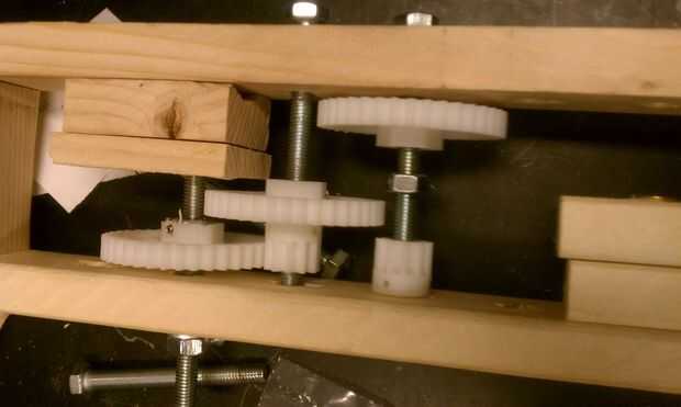 Más madera de 1 x 2 se utilizó para construir un pequeño marco para alojar la caja de cambios. El marco era de tamaño a la longitud de los pernos usados como los ejes de los engranajes. El más largo perno M8 disponible era 100mm que ha demostrado para ser suficientemente grande para que la pila de engranajes.