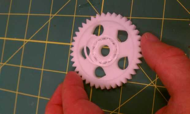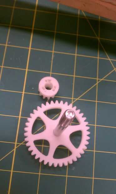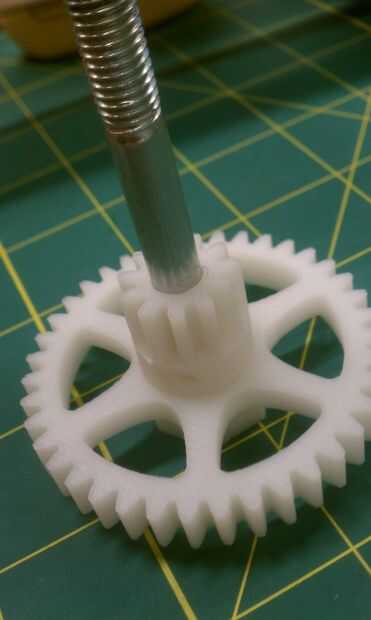 Este archivo STL se imprimió a escala utilizando una impresora 3D. Tornillos de M8 en un local de ferretería caben la forma hexagonal la marcha más grande del interior muy bien. Lamentablemente el engranaje más pequeño fue que no tenía el mismo diámetro. Ya que necesitábamos un par etapas de paso abajo que necesitábamos poder tener el disco de engranaje pequeño un engranaje grande con otro pequeño engranaje comparten el mismo eje. Para acomodar esto el pequeño engranaje cuidadosamente perforó hacia fuera para encajar el eje del perno.