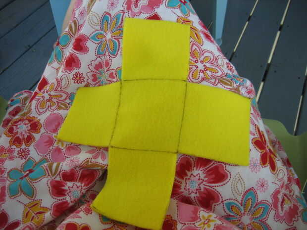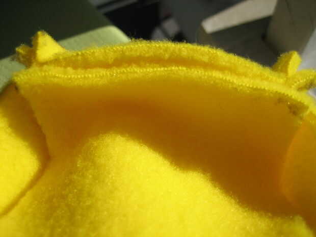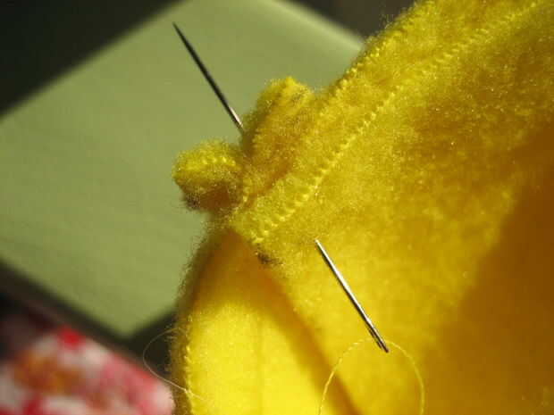 Tome su plus y ponen el lado incorrecto para arriba. Conectar dos de los lados como se muestra en la imagen. Comenzando en el borde exterior (y con un margen de costura de 1/4 de pulgada) coser hasta la línea negra.