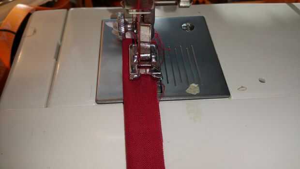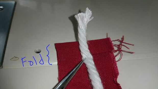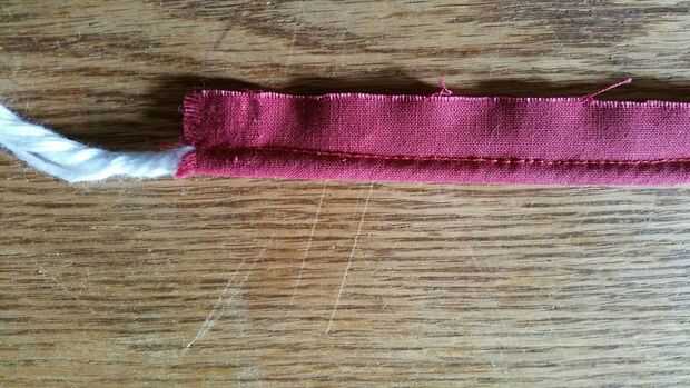 Tomar el extremo superior de la tira de tela roja y doble encima de aproximadamente una pulgada (25 mm), como se ve en la foto 1. Coloque el hilo de la tubería en el centro de la tira de tela roja (Foto 1). Doblar a la tela sobre el hilo y coser una costura recta, a partir de debajo del doblez del extremo superior (Foto 2). El extremo superior debe estar abierto para que se puede ajustar para la longitud en una etapa posterior y a aceptar el extremo inferior de la tubería cuando se cose en la parte inferior del saco. Coser la tira juntos tan cerca como sea posible para el hilado, como se ve en la foto 2. Debe buscar su pieza acabada como la de la foto 3.
