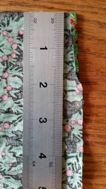 Paso 2: Tomar el pedazo más grande del rectángulo verde y coloque el lado del patrón de la cara de la tela hacia abajo sobre la mesa y asegurarse de que el rectángulo es una orientación de "paisaje". Tomar una de las esquinas superiores y dóblalo sobre.25 pulgadas (6 mm) y pliegue. Hacer el doblez sólo 2 pulgadas (50 mm) de largo. De la forma cónica del doblez por lo que termina en la marca de 2 pulgadas (50 mm) como se ve en la foto 4. Ahora coser los dobladillos con puntada recta. Al llegar las 2 pulgadas (50 mm) marca coser el borde restante con una puntada en zigzag o con una puntada de overlock como se ve en la foto 5. Repita este paso para la otra esquina superior y borde lateral.