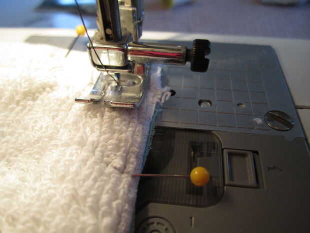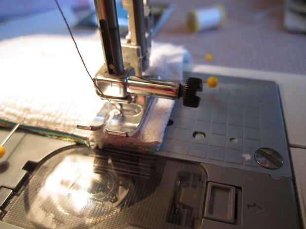 Seguir todo el camino alrededor, levantar el pie prensatela y girar en las esquinas por lo que es una línea continua. Parar cuando llegas a la marca superior de la abertura y pespunte otra vez.