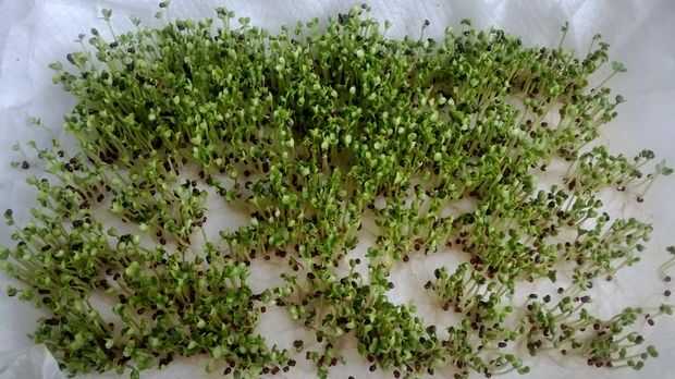 Unos días más hasta que vea los brotes son aproximadamente de 2 a 3 pulgadas de alto. No dejes que crezca demasiado viejo que no lo saben bien (será un poco amargo) y usted tendrá sus propia casa-crecimiento brotes frescos para una ensalada.