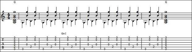 De nuevo, usaré el acorde C/G como ejemplo. Esencialmente, como está jugando el patrón que despide de pulgar, 5-4-6-4, jugar los dos más altos de la secuencia, 1 y 2, al mismo tiempo que tocas la cuarta cuerda. Seguramente hay algunos en alguna parte sobre que dos dedos debe usar la regla, pero no soy consciente de ello, así que te digo utilizar cualquiera de las dos que sientes cómodo con. Tiendo a usar los dedos "m" y "una". (ver imagen abajo)
