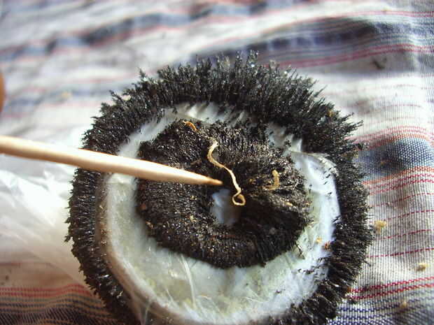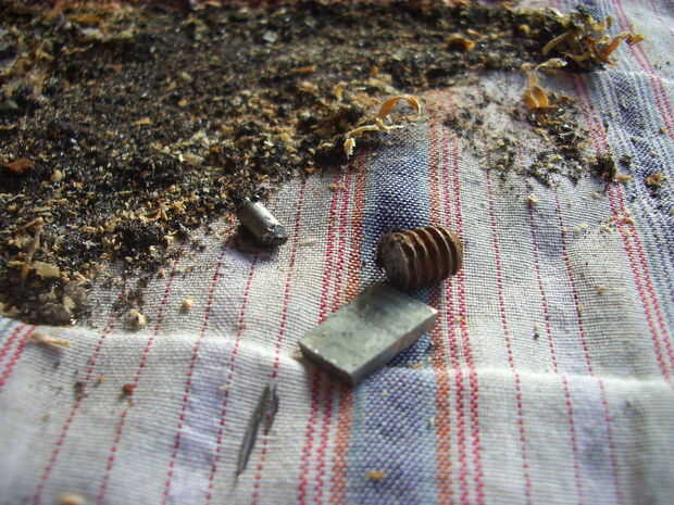Junto con limaduras de imán recoger pequeños trozos de hierro, trozos de alambre, "pelo" de acero de cepillo de acero, etc, etc.. Tienes que eliminarlos. Ayuda de un palillo de dientes. También provoca desechos no magnéticos tales como pelusa, polvo y similares. Una manera de deshacerse de ellos cava limaduras con el palillo de dientes mientras se sopla. Otra manera es pegar la bolsa contra la mesa, que algunas presentaciones pero sobre todo todo lo que cae la gota no es magnética. Las limaduras se puede conseguir para arriba otra vez con el imán. Repetir este procedimiento varias veces es posible obtener presentaciones prácticamente limpios.