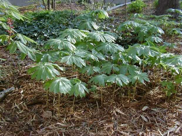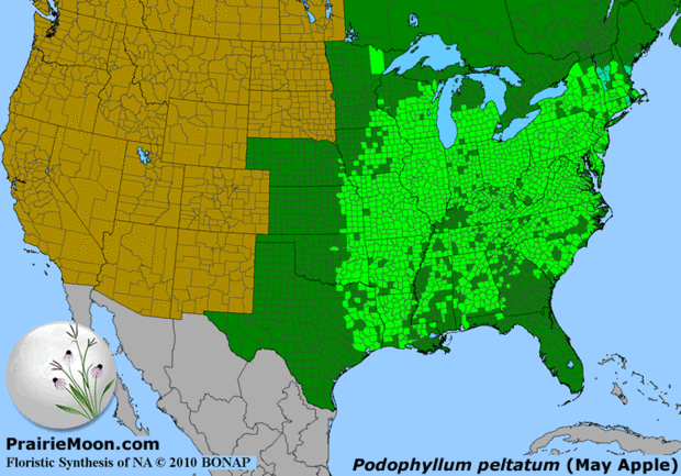 (Ver mapa de Canadá aquí), a menudo en parches densos que contienen solamente las plantas de primera. Cuando aparecen por primera vez en abril sus paraguas-como las hojas están dobladas hacia arriba, pero por pueden desplegar de su una hoja (o a veces dos hojas) es completadas, y una sola flor blanca que florece bajo el dosel frondoso. Si fertilizado, esta flor produce una fruta en forma de bola verde conocida como, usted lo adivinó, la manzana de mayo.