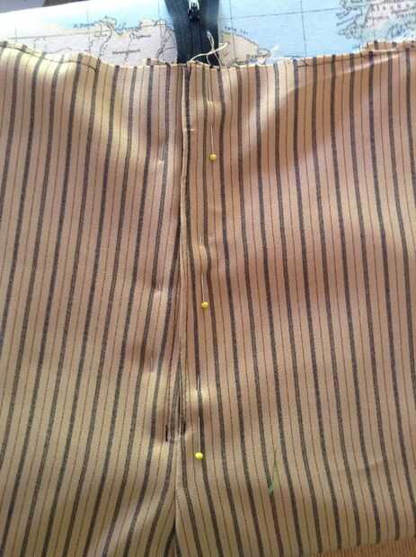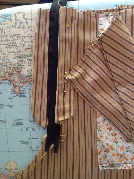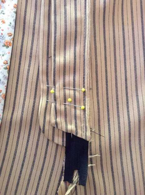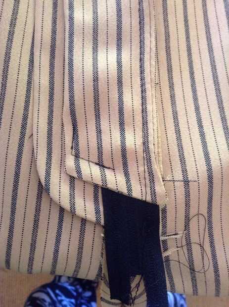 Prender con alfileres la cremallera en el lado izquierdo de la mosca. Gire al revés y perno solo el zip y volar izquierda frente juntos. Virar hacia abajo antes de coser. (Foto 2)