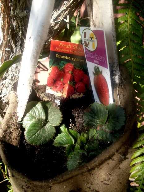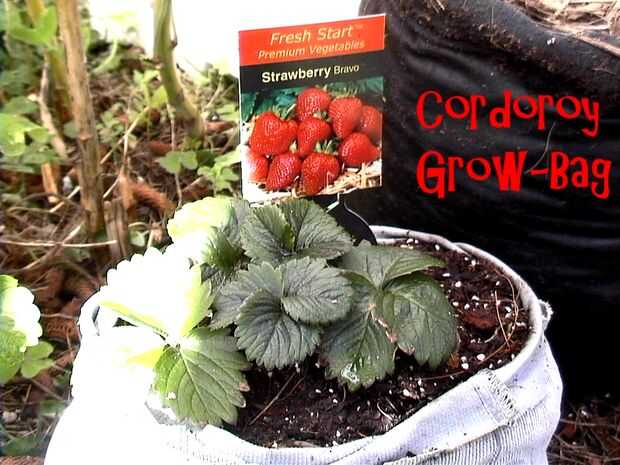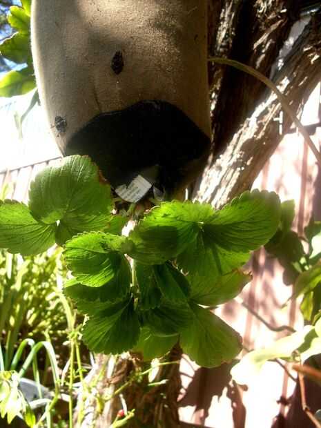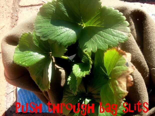 El revés crecer bolsas que hice fueron hechos simplemente de corte encima de leggins de pana y pantalones de lana y las costuras laterales fueron cosidas juntos. Luego añadí odeasas forhanging en un árbol o pared. Fresas parecen prosperar mejor el suelo y tiene menos problemas con caracoles.