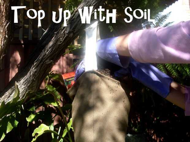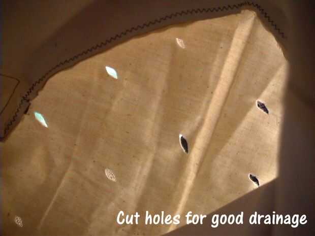 Empuje su planta a través de papel o tela para evitar que el suelo salga de la ranura de la parte inferior. Empuje la planta a través de la maceta al revés. Me gusta para asegurar buen drenaje por orificios de corte en la parte inferior de la bolsa, tirar algunas piedras pequeñas o polvo de roca volcánica para suelo sano, añadir tierra compost y suelo de tierra para terminar la bolsa.