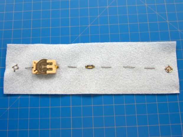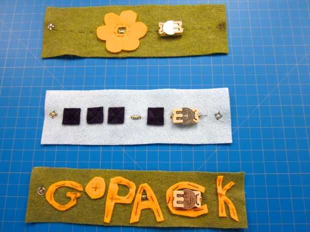 Hacer tus propios tejidos conductores, hilo, pegamento y cinta y usarlos para hacer potenciómetros, resistencias, interruptores, pantallas LED y circuitos.Utilizando pegamento conductor y el hilo conductor puede hacer circuitos y pantallas LED sobre
