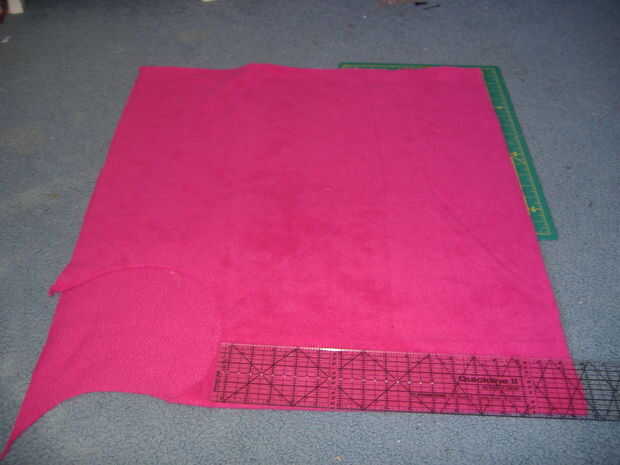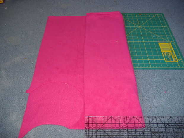 Doblar el restante paño grueso y suave para que el borde te corta para la banda y el orillo en el otro lado están aún. Verás que tienes un círculo que falta desde el borde donde se corta la corona. Doble el paño grueso y suave para que cuando recortas el borde recto, deje la parte que tiene el círculo cortado en él. Cortar el paño grueso y suave con las tijeras o el cortador rotatorio. Cuando abres el rectángulo tendrá una sección de paño grueso y suave que es sobre todo el de 15"- 16" y cerca de 58" de largo. Esto le dará una bufanda terminada que es alrededor de 7" de ancho y 58" de largo.