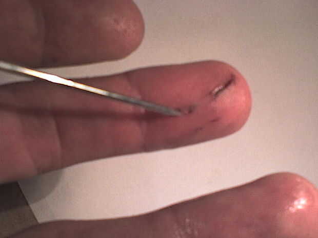 Si no eres capaz de eliminar el material extraño, que le sugiero que deje aquí, envuelva la herida con un vendaje estéril y médico aconsejar.