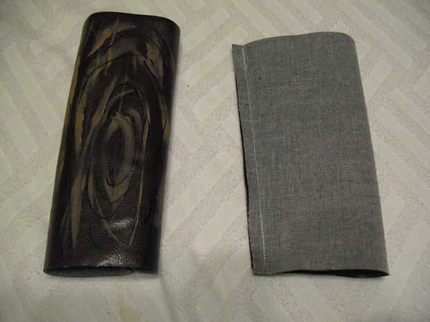 Para hacer los puños, dobla el cuero por la mitad con el lado sin terminar a. Coser una línea recta enfrente del pliegue y luego a dentro hacia fuera. Utilizar pintura acrílica marrón clara y un rotulador de pintura negra para pintar madera patrones sobre la piel.