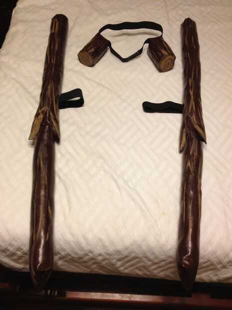 Para hacer tubos, dobla el cuero por la mitad con el lado sin terminar hacia fuera. Coser el lateral y un extremo cerrado luego a dentro hacia fuera. Llenar el tubo con relleno. Cortar un círculo apenas más grande que el extremo abierto del tubo y meta en el extremo abierto. Coser el cierre. Utilizar pintura acrílica marrón clara y un lápiz negro para pintar madera patrones sobre la piel.
