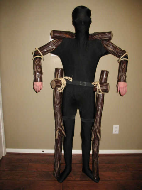 El traje está construido sobre un morphsuit negro. La primera capa es el marco de madera de espantapájaros. Los hombros, las caderas y las piernas sólo tubos de cuero. Los segmentos de brazo superior e inferior son solo los puños.