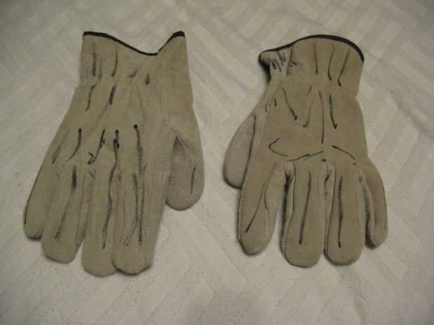 Los accesorios para este traje son los guantes, clave y guadaña. Vivimos en Texas para que reciba sudorosa con guantes sobre un morphsuit para cortar las manos de morphsuit para comodidad. Usé un par de guantes de trabajo y marca con un lápiz de pintura para darles un aspecto desgastado.