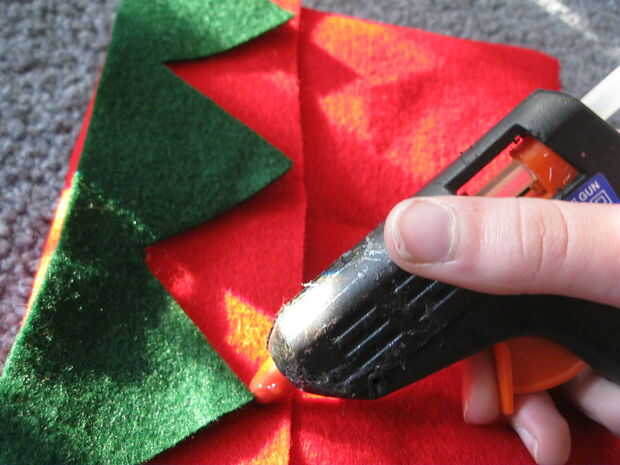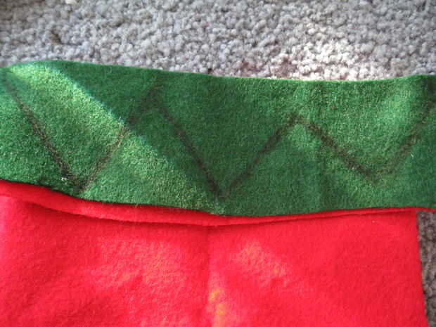 Pone la pieza de fieltro verde encima de la tapa de la bolsa. Marcan un patrón de zig-zag. Se trata de las hojas de la fresa! :) Una vez que has cortado lo, pegamento el fieltro verde sobre el fieltro rojo y tratar de asegurarse de que no puede ver la cola de debajo de la verde.
