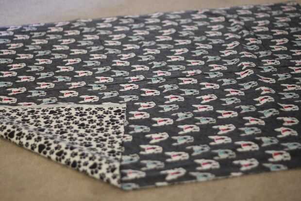 Bien, comencemos. Necesitarás a dos diferentes telas estampadas que son del mismo tamaño. Tengo 1 1/4 yardas para los dos mi perro adorable telas. Corte el orillo y ponerlos mal lados juntos.
