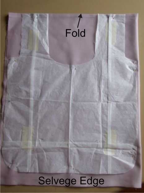 Coloque el tejido de patrón con los mangos sobre el doblez de la tela cuando usted corta, terminará con el pedazo de una tela. Que dobla que ves en el lado de la tela es justo donde dobla un trozo de 1 yarda de tela para que pudiera cortar 2 bolsas a la vez.