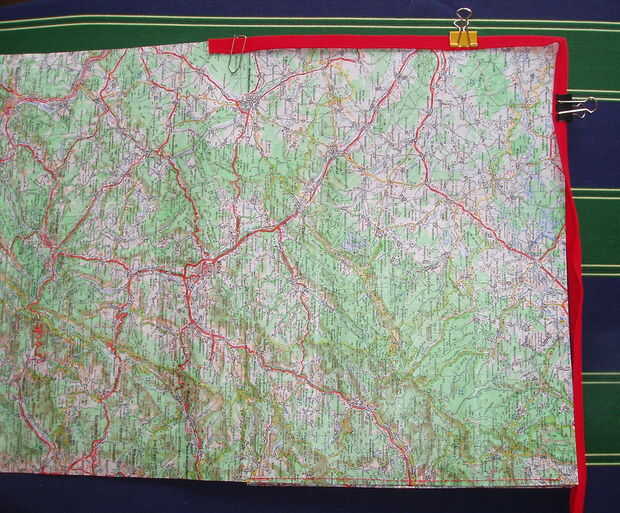 Donde el inserto divisorio está cosido a la tapa frontal la cinta cubra la costura ya aquí. En las esquinas de inglete la cinta tan cuidadosamente como sea posible. Utilicé una cinta tejida que sólo se extendía en la esquina pero si utiliza cinta de bies de algodón que te gustaría un inglete en lugar de hierro.