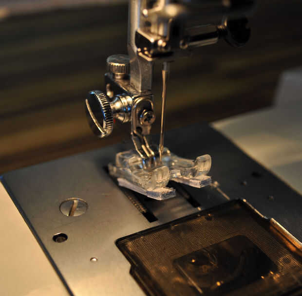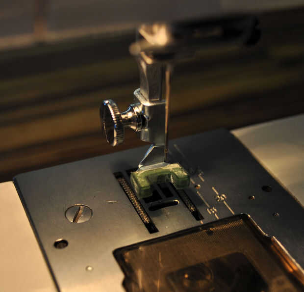 Todavía puede hacer esto si no tienes un pie especial. Elegir un pie que le permitiría hacer una puntada de zig-zag ancho y cinta o pegar un pequeño trozo en forma de U de goma o espuma en la parte inferior. Será más difícil ver los agujeros de botón para establecer sus puntos, pero con un poco de práctica se puede hacer. La primera foto de arriba muestra un pie de botón real y mi pie botón imitación. La segunda imagen muestra el pie de botón real conectado a la máquina, y la tercera muestra el pie falso botón en la máquina. Para efectos del presente Instructivo va a utilizar uno real simplemente porque será más fácil para usted ver lo que estoy haciendo.
