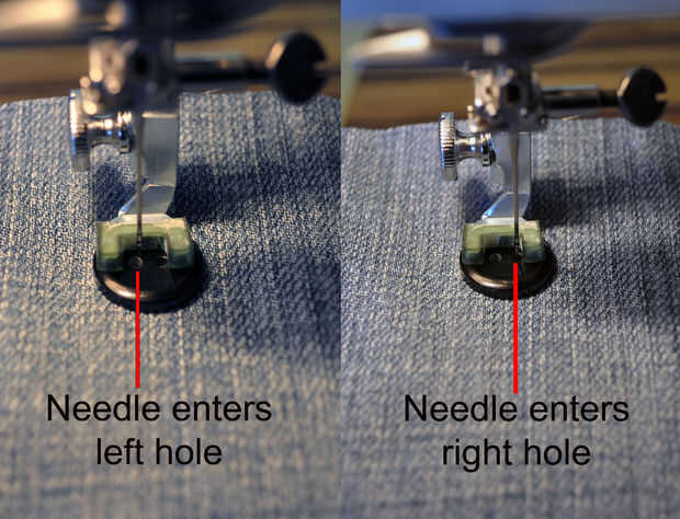 Coloque la tela y el botón para que los dos agujeros de que van a coser a través se centran en el pie justo debajo de la aguja. Ahora ajuste la anchura de la puntada para que cuando la aguja cae en el lado izquierdo que va directamente a través del centro del agujero izquierdo, y cuando viene a la derecha va directamente a través del centro del orificio derecho. Para probar esto cuidadosamente girando el volante hacia usted hasta que usted vea donde la aguja va a ir. Si la aguja parece que va a impactar el botón, parar y ajustar el ancho de puntada otra vez. No pise el pedal hasta que esté seguro de que la aguja no se va a golpear el botón!