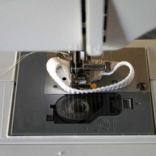 Si usted está usando una banda elástica de anchura pequeña (por ejemplo, 1/4"), zigzagueando unos puntadas rectas deberían ser adecuadas.