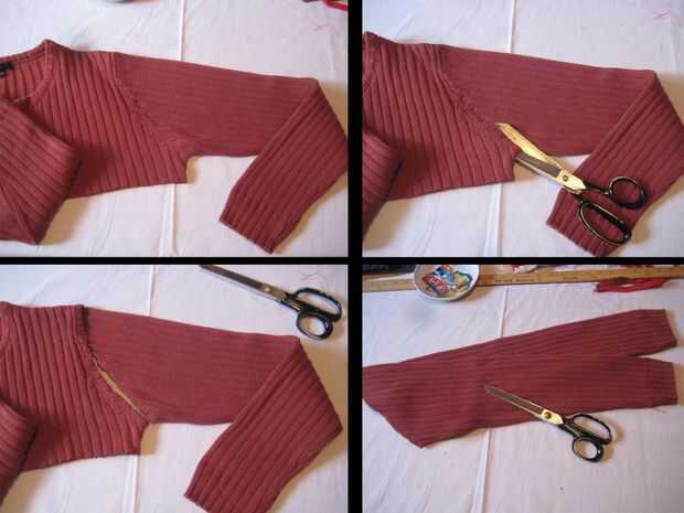 Poner el plano del suéter y encontrar la costura del hombro. Utilice las tijeras para cortar el interior de la costura del hombro para separar la manga del cuerpo de la chompa. Lo mismo para ambas mangas.