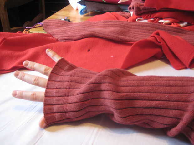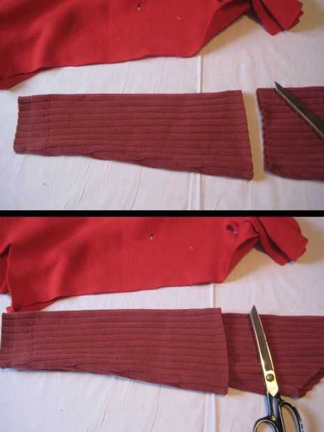 Corte recto en el extremo de la manga marcada con el pasador. Este es el final de su guante. Una vez que la costura se dio vuelta bajo cosida, esta longitud será ligeramente menor que la longitud de su antebrazo y permitirá de máximo movimiento. Coloque la manga corte encima de la manga sin cortar. y corte la segunda manga a la misma longitud que el primero.