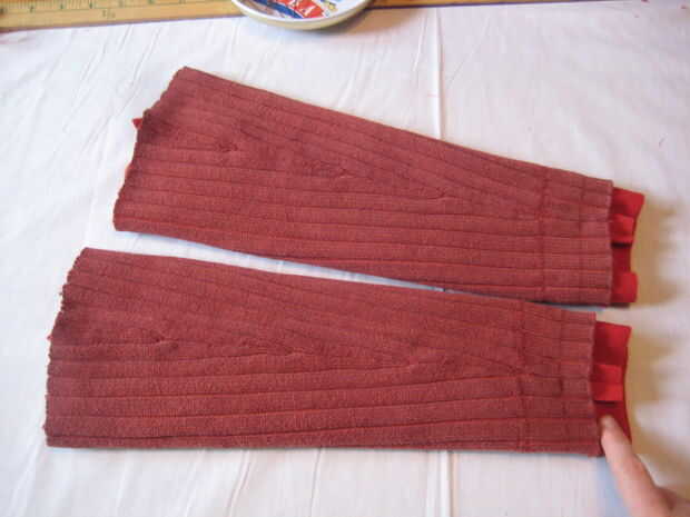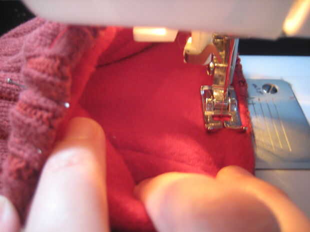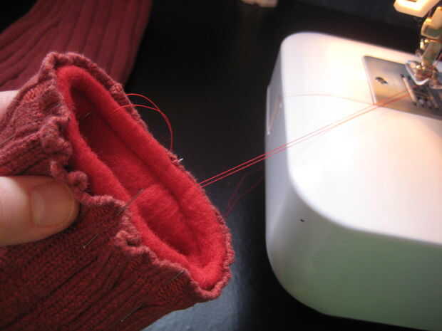 En el borde más ancho de la manga, gire la guarnición del paño grueso y suave y la capa suéter debajo (en uno hacia el otro), 1/2 pulgada cada uno. Prender las capas en su lugar.