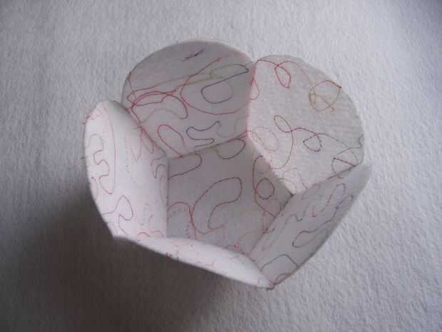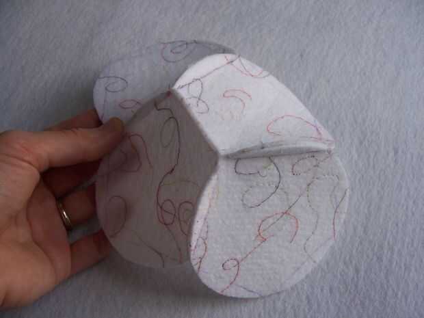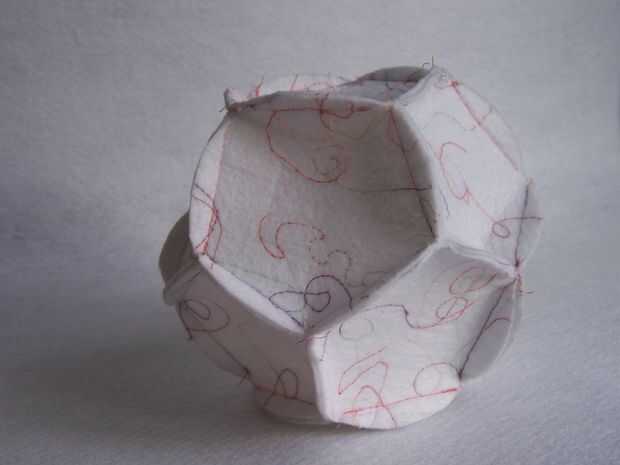 Empezar escogiendo en círculo a su "amo el círculo". Coser un círculo a cada uno de los 5 lados de este círculo, coincidencia de las líneas de costuras y costura en estas líneas. A continuación, coser los lados de los círculos que son adyacentes entre sí. Asegúrese de que todos los márgenes (el pequeño Crescent sobresale) están en el mismo lado de su dodecaedro. Después de hacer esto usted tendrá algo que parece un poco a un recipiente. (Un tazón de fuente es un proyecto fresco en sí mismo!)