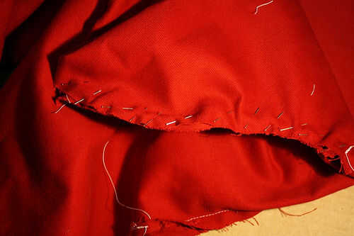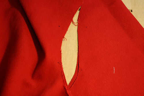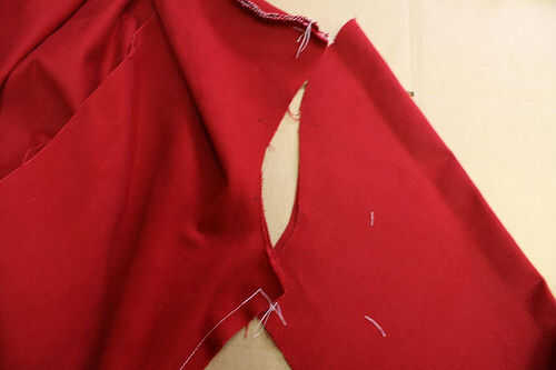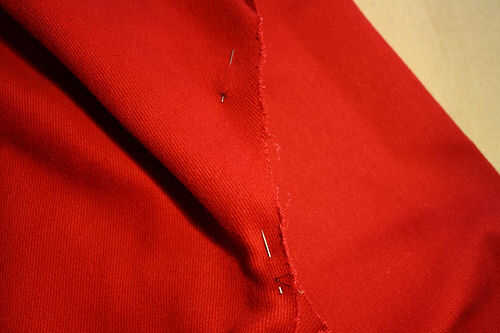 PIN una manga en su lugar, alineando las marcas de la muesca. Utilizar un montón de clavijas para distribuir al tejido en exceso y para reducir al mínimo cualquier arrugas. Coser las mangas en su lugar.