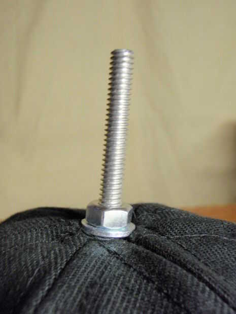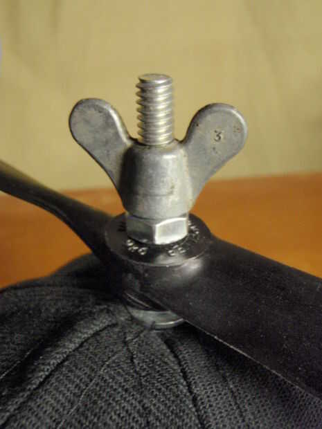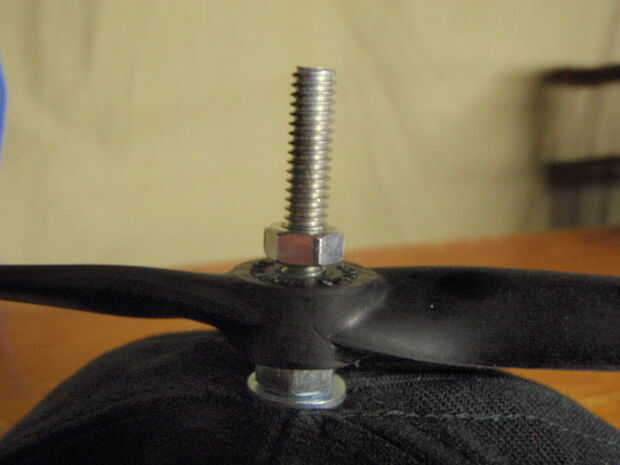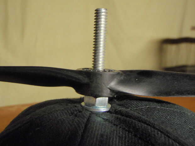 Inserte el eje de la hélice en el agujero en la parte superior de la gorrita tejida y pasar hasta que la base de la hélice está apoyada en la parte superior de la tapa. Añadir a la lavadora, la primera tuerca, la hélice, la segunda tuerca y tuerca de mariposa, que es estrictamente para la decoración. Apriete las tuercas para que el disco gira, pero no se balancee.