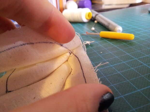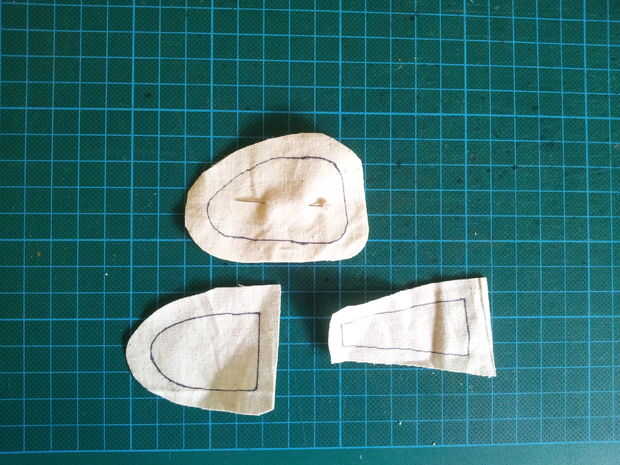 Comenzar a unir los laterales de la cabeza y la barbilla, encarando los derechos entre sí. La forma más sencilla de hacerlo es dibujar el contorno de la pieza en cada pedacito de la tela y simplemente conecte las líneas usando una aguja de coser, ver la tercera imagen.