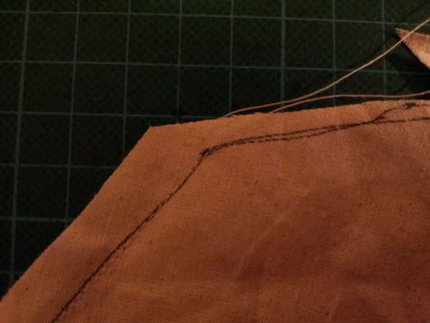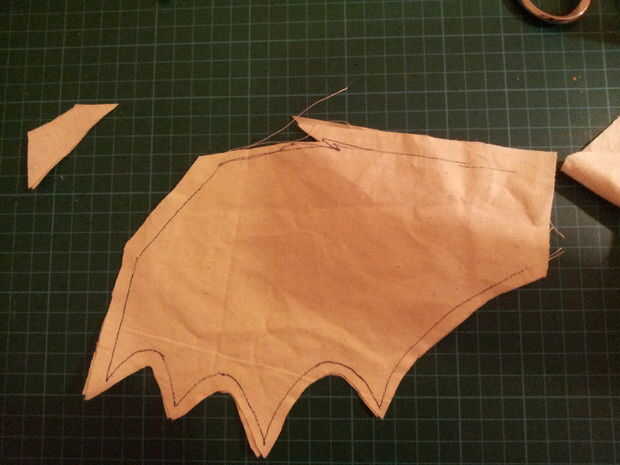 En primer lugar, corte y costura, con la máquina, dos lotes de los patrones del ala. Coser todo menos la parte superior de la segunda vuelta del ala (la imagen muestra zona).