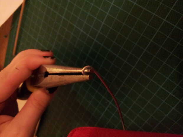 A continuación cortar una longitud de cable de largo como su antebrazo, tan alargado. Es mejor tener demasiado que demasiado poco. Hacen un rizo pequeño con unos alicates y doblar un poco en la forma del hueso del ala primera. Esto sólo es difícil para el primero de ellos, el resto utiliza la curva natural del alambre enrollado. Colocar en la parte superior del ala derecha-manera-hacia fuera y marca un canal ligeramente más ancho que el alambre. He usado rotulador permanente, se puede utilizar cualquier cosa que adapte a sus necesidades.