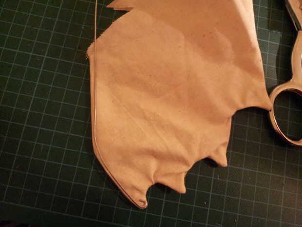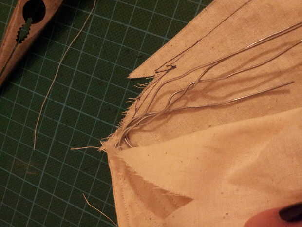 Utilizar la máquina de coser para coser el canal y luego deslice el cable en. Puede doblar en mejor forma ahora que está allí. Suavemente doble el alambre restante para que corre paralela al borde de las alas plegado. Antes de que termines con el ala cosa algunas puntadas a través del lazo en el extremo de cada hueso de alambre para evitar moverse demasiado.