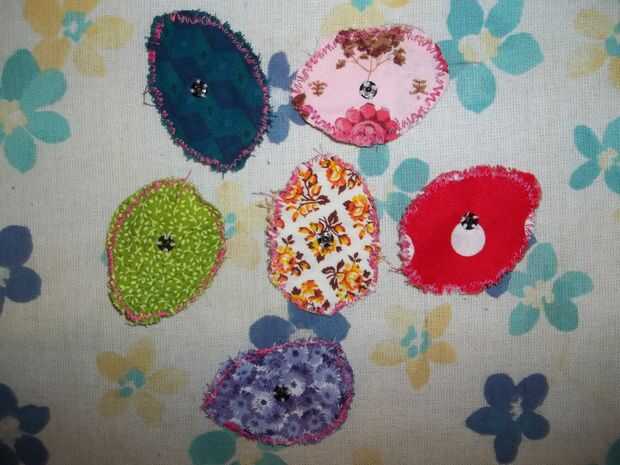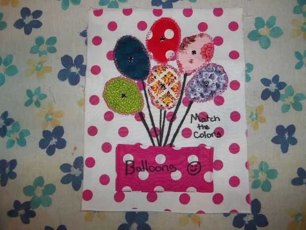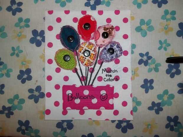 Primero corte una forma de globo ovalado de papel para usar como plantilla. Luego lo trace en 6 telas de diferente color 3 veces para un total de 18 piezas. Organizar 1 de cada color en la mitad superior de una página y coser en.  Con las piezas restantes empareja para arriba para los correspondientes lados equivocados están uno frente al otro. Unirlas. A continuación necesitas dos trozos de tela para crear un bolsillo para sostener las piezas del balón. Mida su tela para conseguir un buen ajuste en tu página. Coser las piezas junto con encarando los derechos y recuerden dejar un espacio de 2 pulgadas para el torneado. Cortar las esquinas y girar a la derecha hacia fuera. Colocar el bolsillo en la página y coser alrededor de los lados y la parte inferior para mantenerlo en su lugar. Ahora fije los broches en el centro de los pedazos de globo en la página y los sueltos. Luego utilice los botones en la parte superior de las piezas del balón para decoración añadida.  Use su marcador de tela para añadir los toques finales. Escribí "coinciden con los colores" y "globos".
