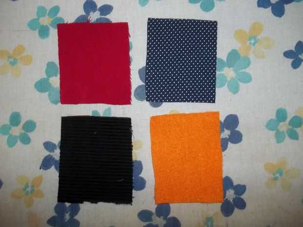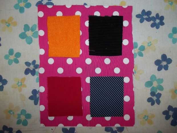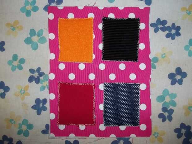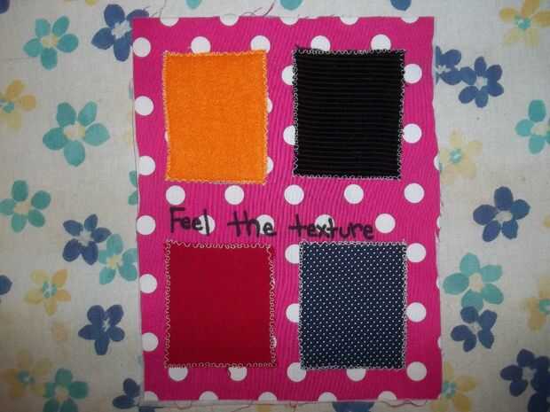 Encontrar 4 diferente texturado telas escogí lana, pana, terciopelo y un tejido lleno de baches. Hacer un rectángulo de la plantilla de papel que encajaría bien en su página 4 veces. Trazar y cortar sus rectángulos. Luego colocarlos en tu página y coser en. Entonces escribí "siente la textura".