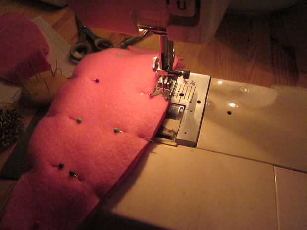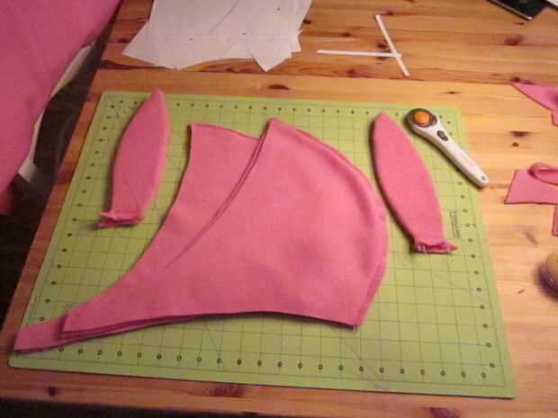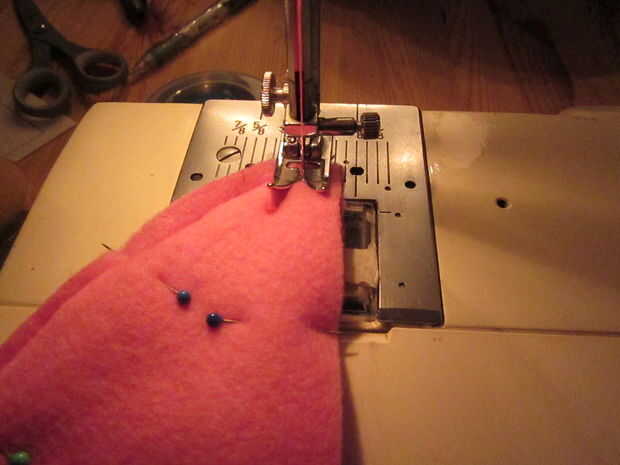 Hay dos cortes de ángulo agudo en la base de las orejas. Coser a lo largo de un recorte hacia arriba gire a la oreja como se muestra y coser el resto del camino hasta el otro recorte. dejar el espacio entre los cortes abiertos.