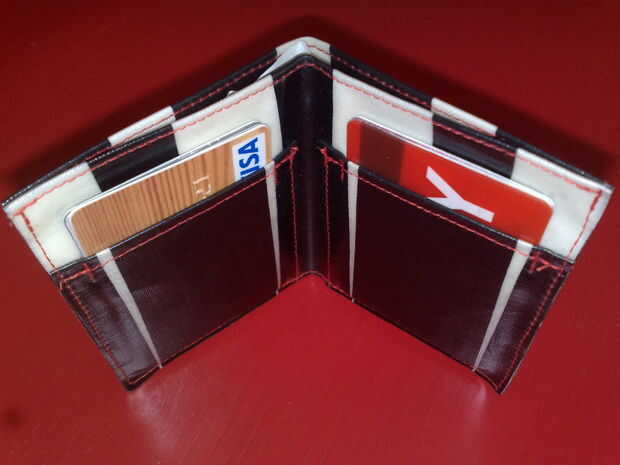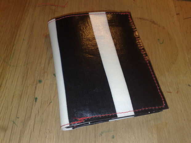 Debajo está una imagen de lo que mi nuevo look elegante billetera como. La tela es hecha por Tom Hedqvist uno de los miembros en el grupo de diseño sueco 10-gruppen. Escogí un hilo rojo que se destaca y es una parte del diseño en lugar de algo para mantener la cosa juntos.