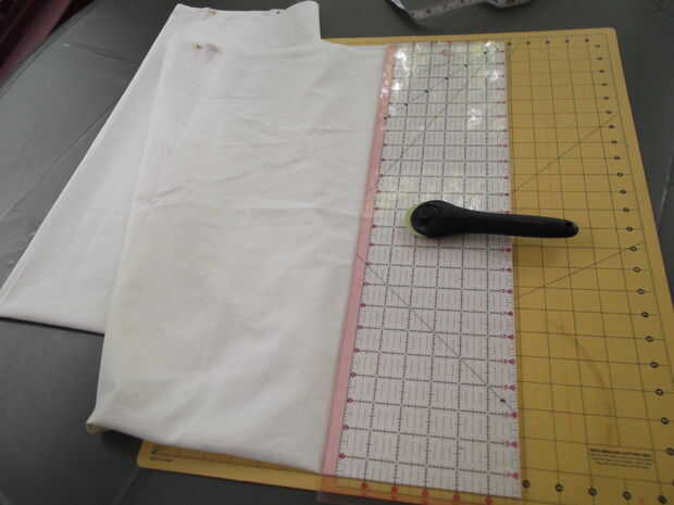 En primer lugar, medir la mesa y cortar el material (dejando una pulgada extra de 3/4 en todos los lados para margen de costura). Si el material es fino, corte dos capas, hierro y coserlas juntas.