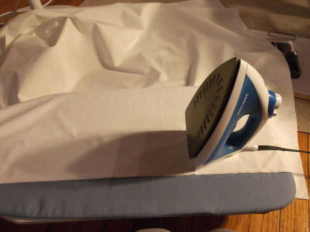5 1/4 in. Estas piezas conforman el material que ves en las imágenes por debajo de la parte con volantes/peplum. Todas las piezas de material de hierro. Si desea utilizar cinta de bies en el borde inferior del material, depende de usted. De lo contrario, se necesita planchar y dobladillar la parte inferior de las piezas. También de hierro y presiona la parte superior del material. Ahora necesita coser las cuatro piezas juntas en los lados para formar un lazo largo.
