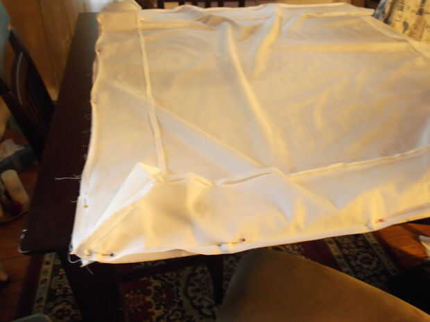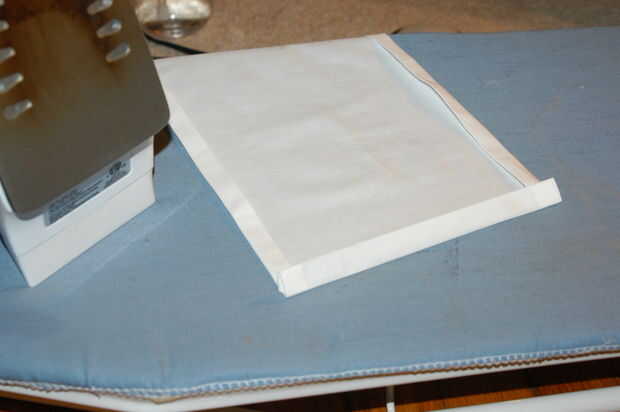 A continuación, pin esta pieza toda de material a la pieza principal del material. La principal pieza de material será derecha arriba - y la pieza que han depositado en estará mal lado, cierre a la tubería. Como ves en la imagen de abajo, puedes ver que después de coser en, serás capaz de Dale la vuelta y hacia abajo, y después presiónelo otra vez con el hierro.