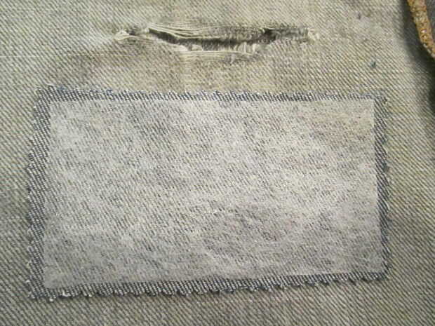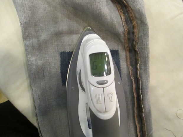 5. plancha a fuego alto, sin necesidad de vapor. Pasa lentamente la plancha sobre el parche, aplicando el calor completo a todas las áreas del parche. Veinte segundos debería ser suficientes. El pegamento de la entretela no se atascan a los vaqueros en el otro lado del agujero. Es muy ligero y realmente sólo se desintegrará con el calor alto.