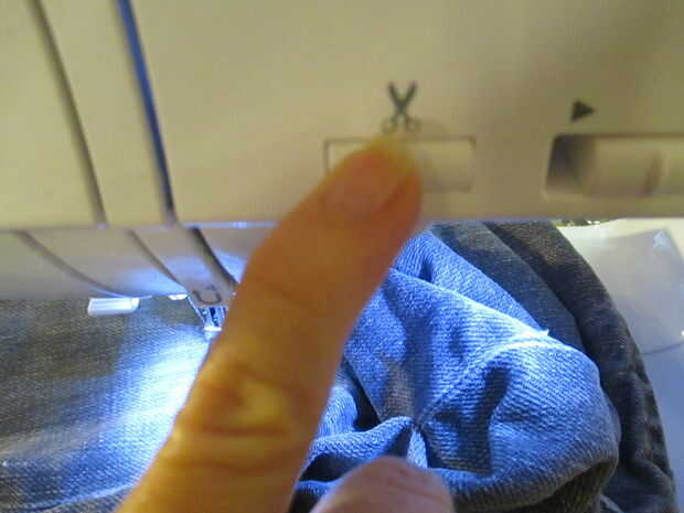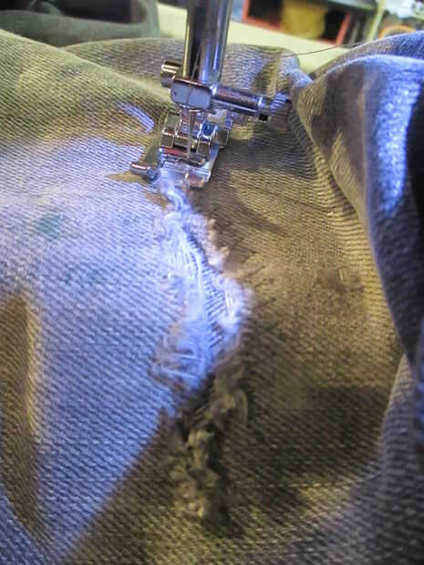 2. Alinee el dedo del pie que queda de la aguja con el borde de la lágrima. Esto es una buena guía para asegurarse de que usted tome a suficiente tela de los jean que está todavía intacto, pero no demasiado lejos de la lágrima para que pudieran obtener más grande en el futuro.