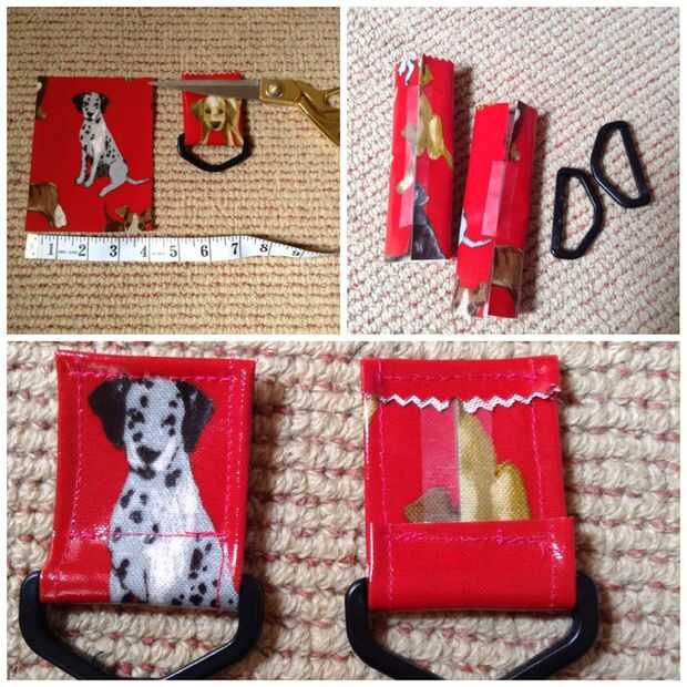 Cortar 2 piezas de 4 "x 4". Plegar hacia el centro de la cinta. Puntada hacia abajo de ambos lados.
