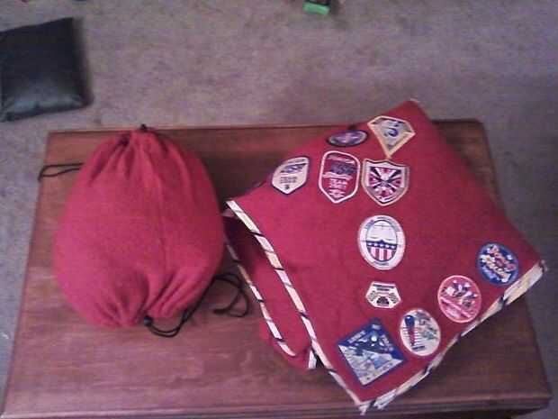inspirado en:Tomó la mochila de Boy Scout de década de 1960 viejo de mi papá, quita los bolsillos y marco, cortan la bolsa, forrado con una suave manta (que tomé de un vuelo de línea aérea) y cosido detrás junto.  Coser un bolsillo en el frente hace