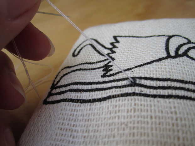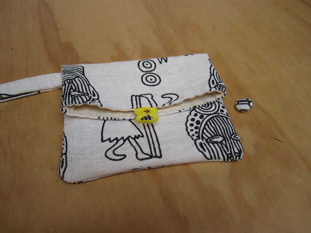Use un marcador para colocar un punto donde te cose el botón en el. Coser el botón firmemente - se más fácil de mantener una mano en el embrague para ayudar a guiar la aguja hacia adentro y hacia afuera. Para anudar, gire el embrague adentro hacia fuera por lo que fácilmente puede nudo fuera de la tela del forro como se muestra en la última foto.