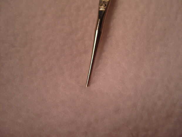 Remolino de un extremo de cada uno de ellos, para que tenga un par de bucles. Tomar un pequeño ganchillo o el pedazo de metal extremo de un lápiz mecánico y meter cuatro agujeros sobre una 1/2 pulgada aparte cerca de la parte delantera del sombrero a cada lado. (Puede probarse el sombrero para tener una idea de donde quiere estar. Entre pelo de sombrero, como se muestra a continuación.)